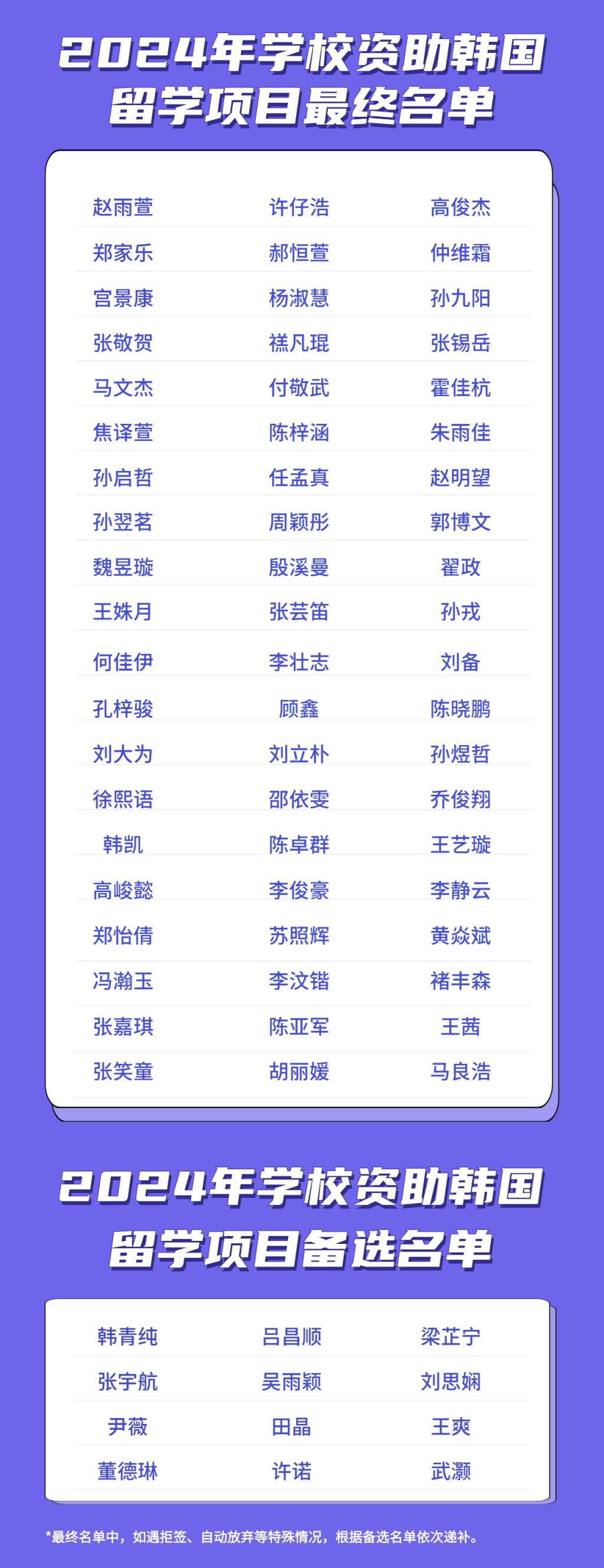 最终名单中,如遇拒签、自动放弃等特殊情况,根据备选名单依次递补。
