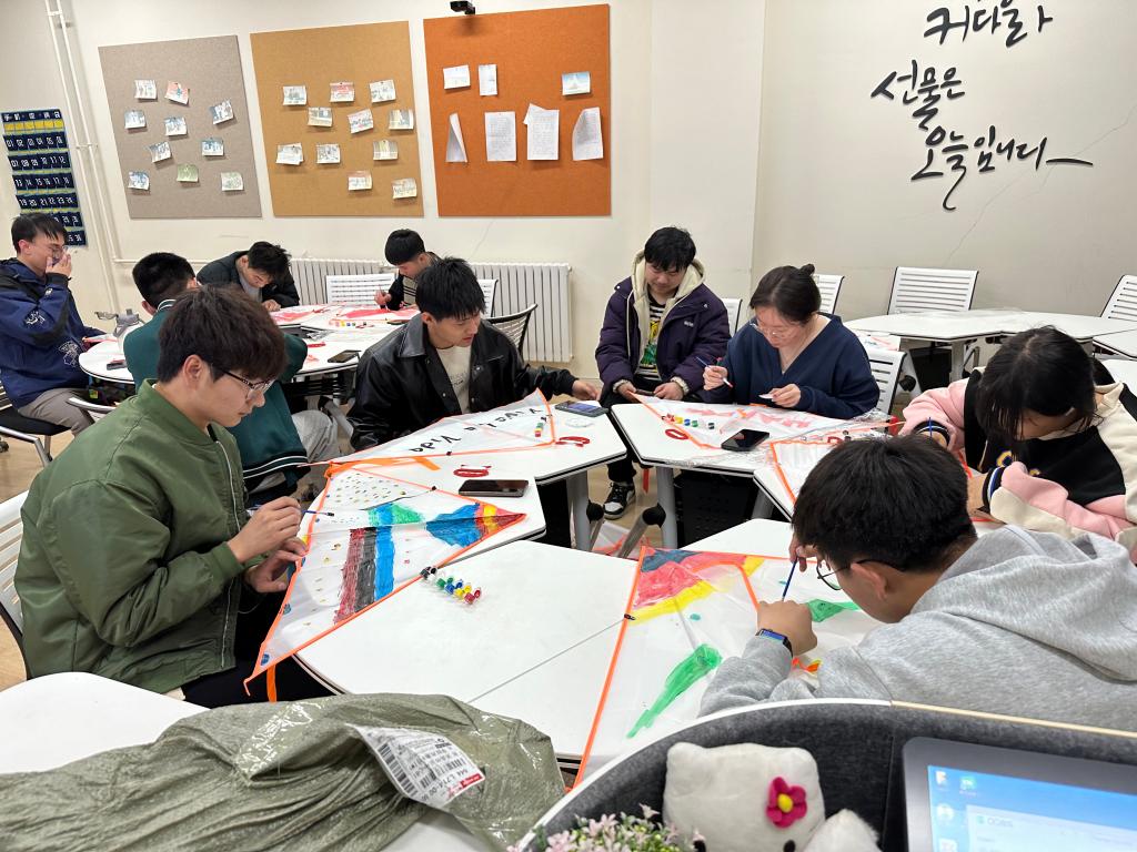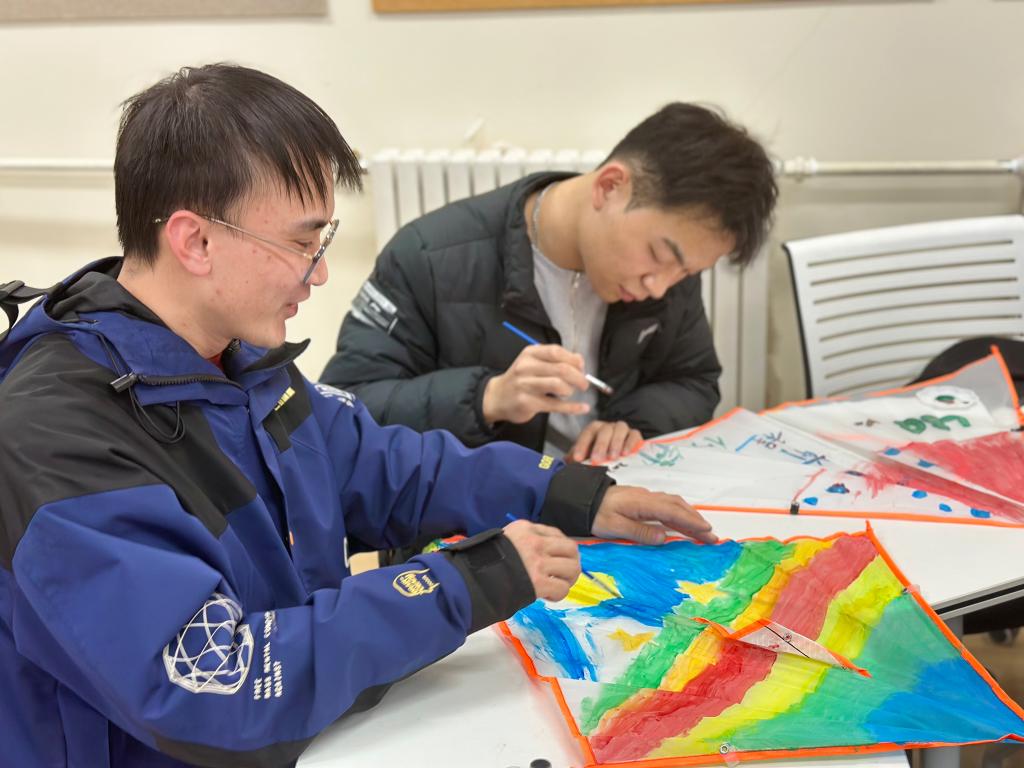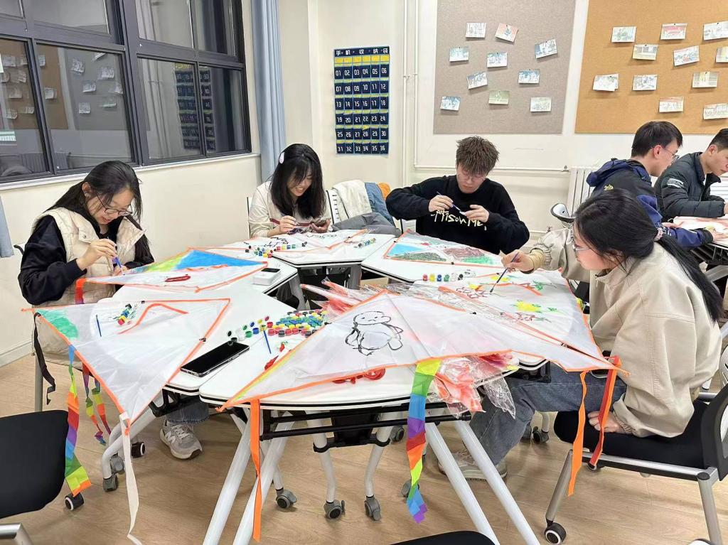 在新言106活动室,同学们在空白的风筝上作画。春来大地,万物归新,学校湖边的柳枝已抽出嫩芽,三月为大家带来了不少春天的元素,也为此次活动带来了许多灵感。同学们积极创作,用不同的色彩描绘春天的故事。