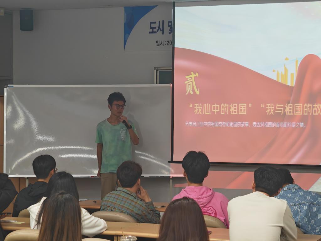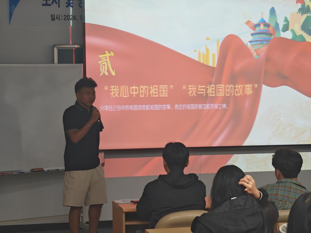 第二个环节,进入“我与祖国的故事”主题交流环节。大家饱含深情地回忆起与祖国的点点滴滴,有的讲述了自己在祖国的怀抱中茁壮成长的经历,有的描绘了祖国的壮丽山河和悠久历史,还有的分享了祖国在科技、文化等领域的伟大成就。我们虽身在韩国但我们心系祖国,也谨记身在国外我们的一举一动不只代表学校,更代表中国。这些故事让在场的每一个人都深刻感受到了祖国的强大与温暖,进一步激发了大家的爱国之情。