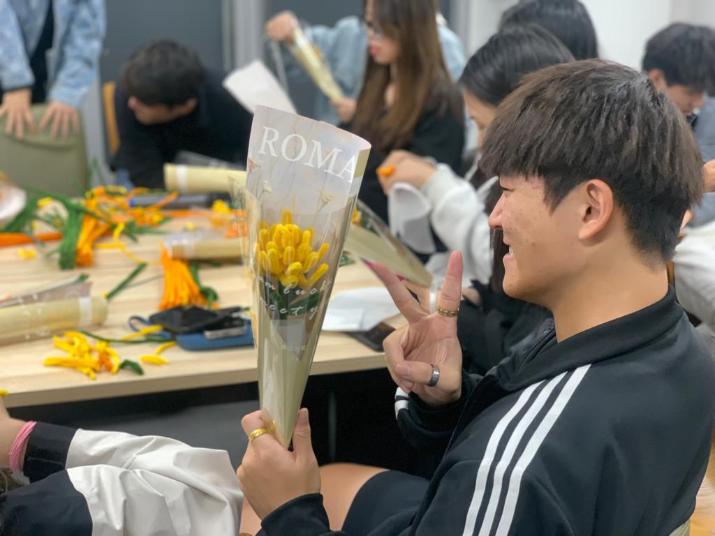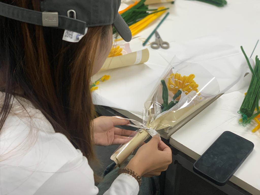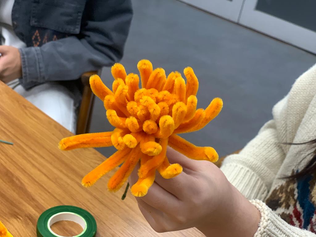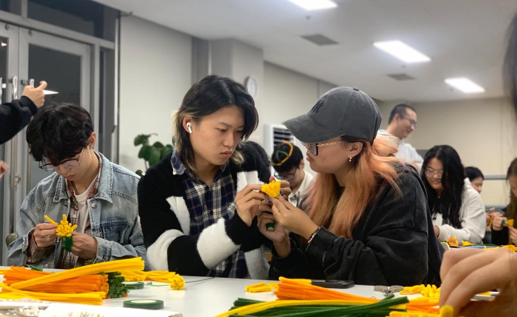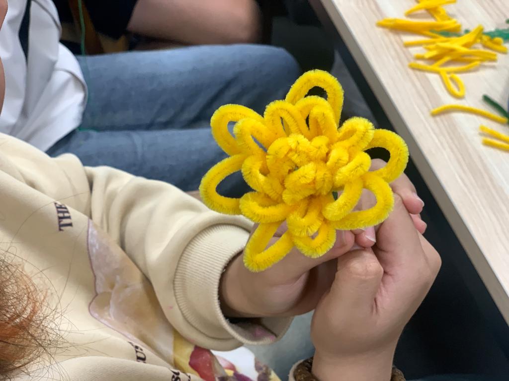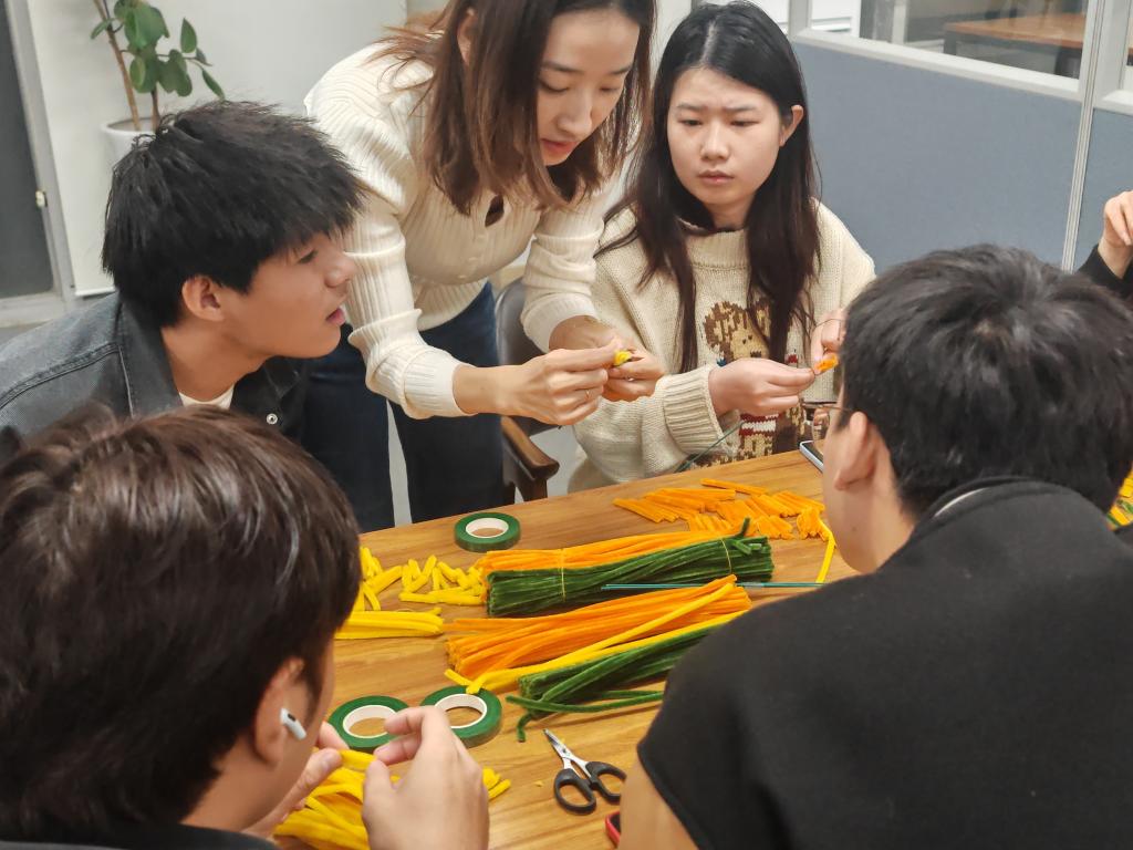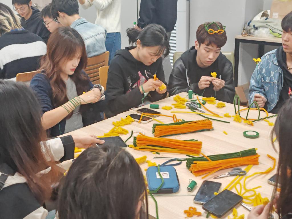 活动现场,气氛热烈而温馨。大家围坐在一起,交流着彼此的创意和想法。在巩少雯老师的带领下一起动手制作菊花,那一根根色彩鲜艳的扭扭棒,如同蕴含着无限可能的魔法棒,等待着交换生们用它们创造出美丽的菊花。