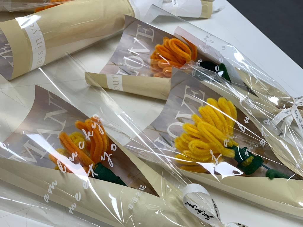 为了让菊花更加生动,最后大家纷纷拿出绿色的扭扭棒制作菊花的叶子。将绿色扭扭棒剪成合适的长度,然后用手将其弯曲成叶子的形状,再用绳子把叶子绑在菊花的底部。这样,一朵朵完美的菊花就制作完成,每个人手里都有着不一样形状的菊花。