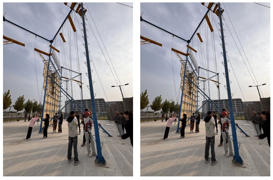 合力过桥是本次挑战赛中第二个团队高空项目。通关需要团队中队员们齐心协力,共同度过此关。过程中同学们携手共进,互相扶持,无不展现了团队的力量和凝聚力。