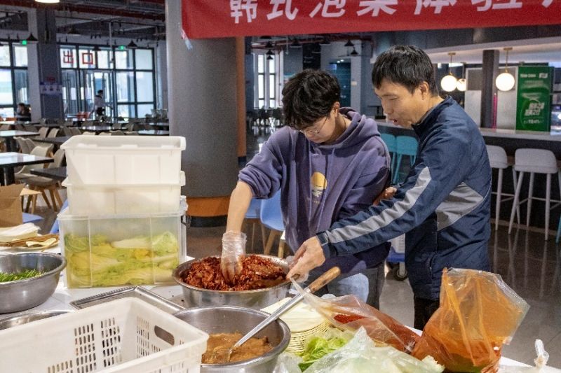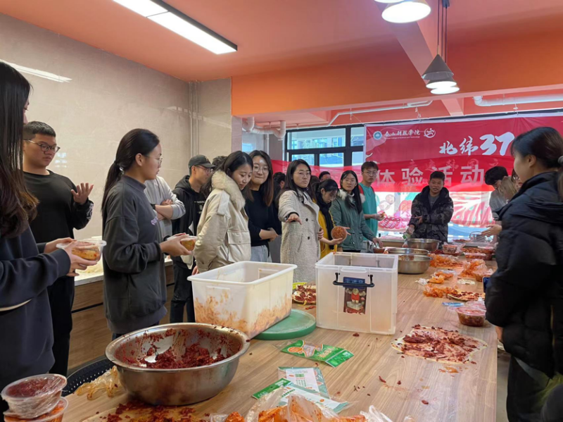 贺国瑞向大家详细介绍了配制调料、制作韩国泡菜的方法,并亲自示范。师生们根据讲解,将制作韩国泡菜所需材料进行了处理,并在贺国瑞的耐心指导下,制作出美味的韩国泡菜。