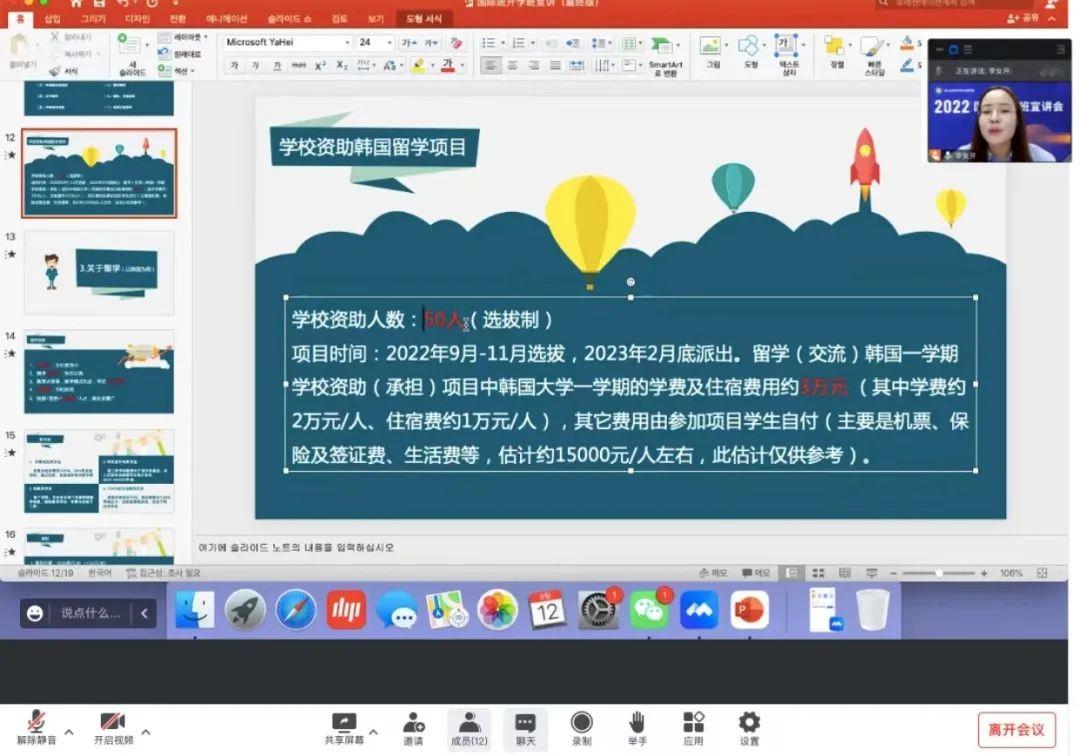 宣讲会由77779193永利老师担任宣讲人,分别面向2022级新生开展宣讲。就我校的3+3专本硕连读项目,3+2专升本项目,4+2 本升硕项目,资助韩国留学项目以及韩国留学常识,国内的升学就业现状以及去韩国留学的优点进行了讲述,并结合自身经验分享了自己在韩国四年留学期间的经历和所见所闻。