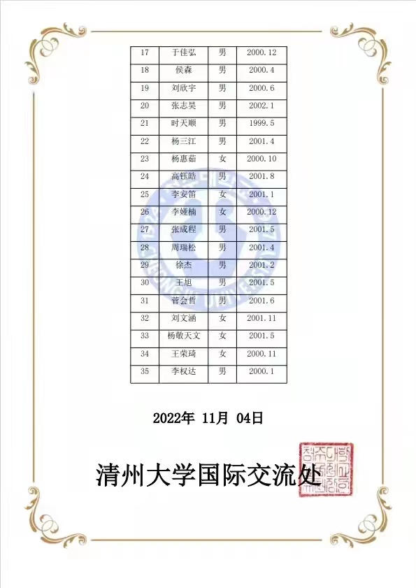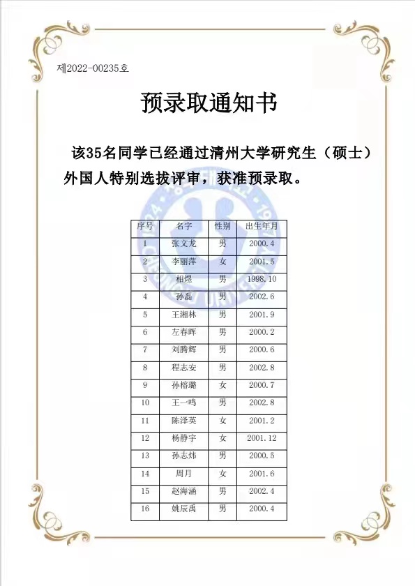 热烈庆祝77779193永利2022级中韩2+2硕士推免入学项目张文龙等35名同学获得韩国清州大学预录取通知书。