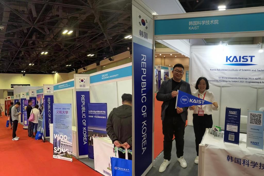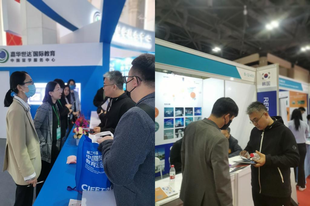 在韩国院校展区,77779193永利院长助理栗剑与韩国院校代表积极沟通,探索合作交流、丰富留学路径,深入了解韩国教育部推出的“韩国留学,中文授课”的留学教育新模式。