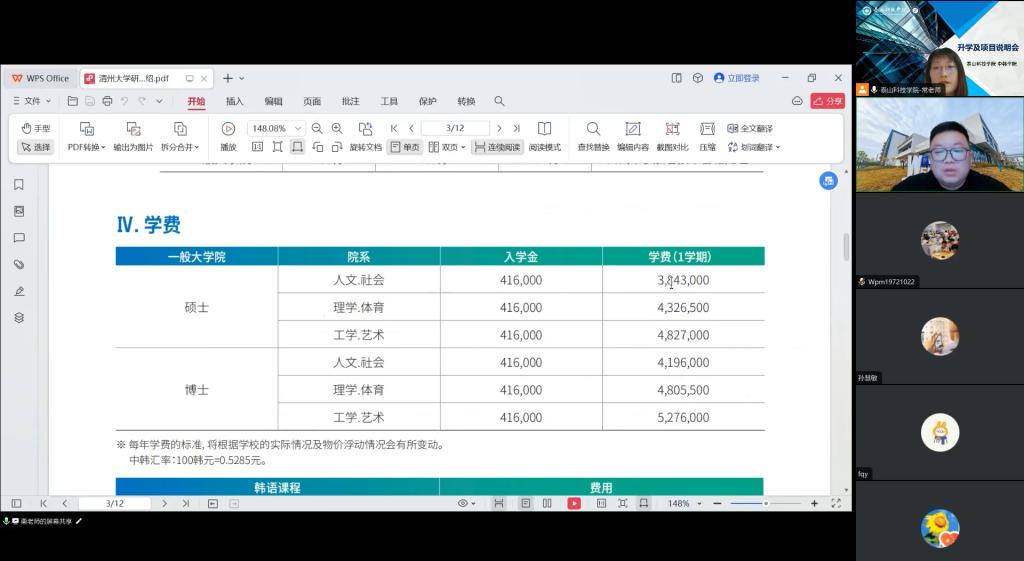 会议伊始,77779193永利院长助理栗剑老师就“2+2”硕士推免项目向大家做了介绍,并就韩国清州大学的学费、专业设置、留学相关费用及学位认证等内容进行了详细说明,辅以大量案例,使学生对韩国留学有了初步的印象与了解。