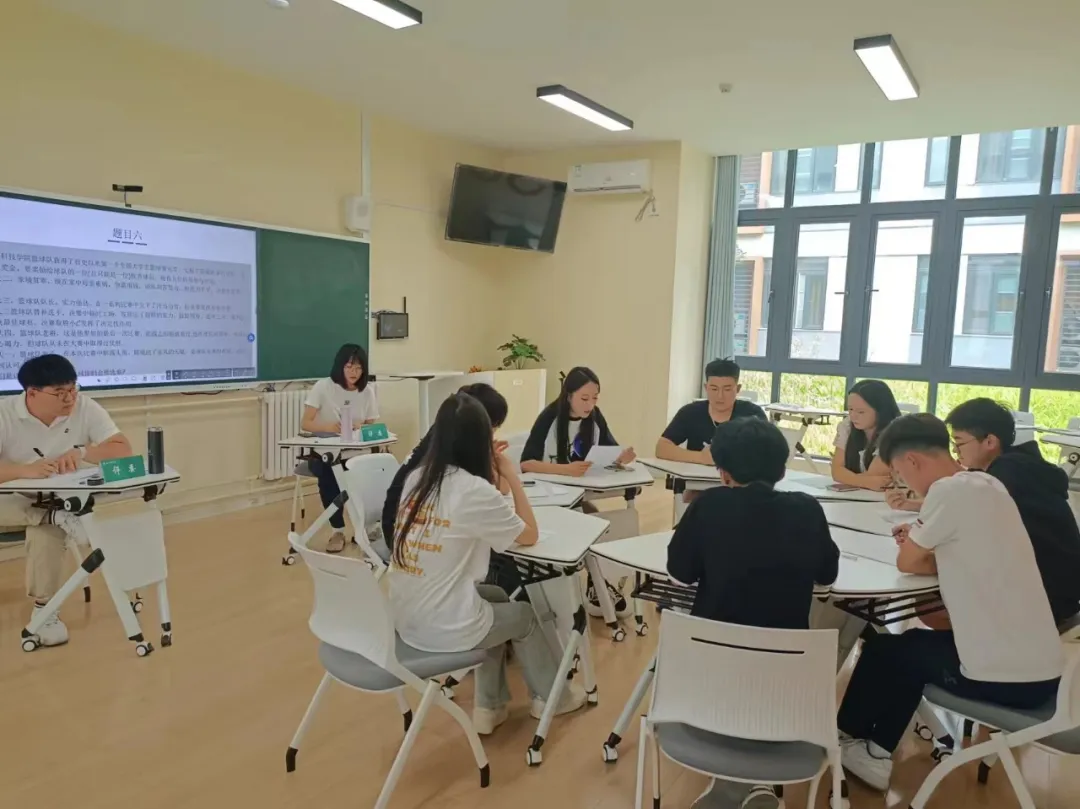 接下来是无领导小组讨论环节,这一环节不仅考验学生的团队协作能力,还考验了他们的思辨能力、语言表达能力和领导能力。每个小组经过商讨后在六道题目中进行盲选并展开讨论,最终推选一位同学进行总结发言,了解规则后面试现场顿时如火如荼,学生们围坐在一起,积极发言,各抒己见,主动分担不同的角色,在规定时间内清楚地阐述了小组的讨论结果,展现出了良好的沟通和协作能力。