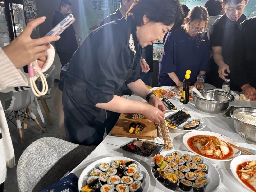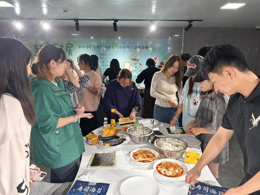 活动当天,五汶书院轻食厨房内弥漫着美食的香气,一片欢声笑语。外籍教师李美惠不仅带来了韩国的传统美食,还亲自指导学生们制作紫菜包饭、大酱汤和辣炒猪肉。在李美惠老师的悉心指导下,学生们兴致勃勃地参与进来,亲手体验了一把韩国料理的制作过程。从食材的准备到烹饪技巧的运用,每一步都充满了乐趣和收获。