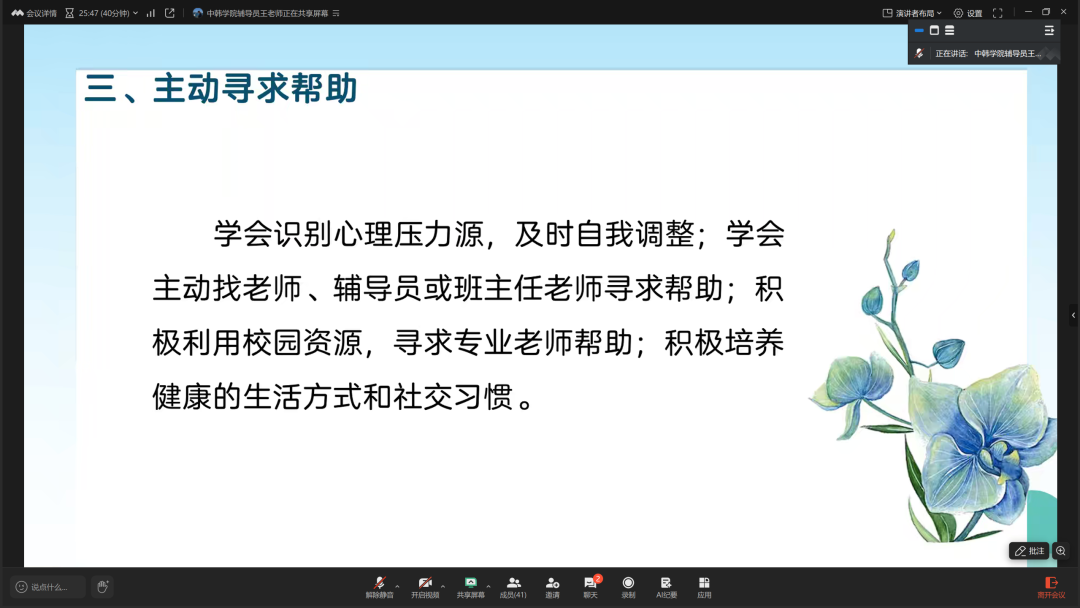 班会最后,王老师重点讲解了心理调适方法。她指出:“压力源可能来自学业、人际或未来规划,当感到焦虑时,可通过运动、倾诉等方式缓解。”同时,她详细介绍了校园支持资源:“学校设有心理咨询中心,配备专业教师;辅导员24小时在线;班级也成立了互助小组,鼓励大家主动分享困扰。