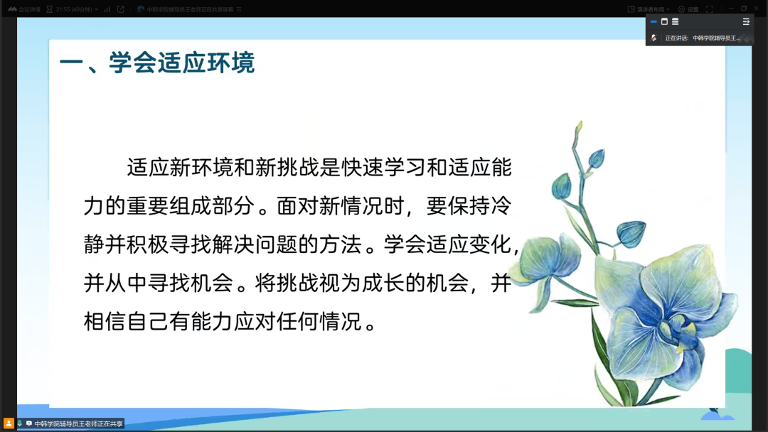 面对新学期课程,为帮助学生快速融入校园,王老师提出以下建议:转变居家习惯,学会包容与团结,寝室卫生需集体协作完成,后续将安排每日值班表,确保环境整洁。鼓励利用校园资源,如心理健康教育中心的放松设施(按摩椅等),建议主动与心理中心老师交流,培养健康的生活方式和社交习惯。改变拖延习惯,专注学业。针对学院学生,王老师提到学院升学率良好,鼓励有意向留学的学生提前准备语言考试;暑假赴汉阳大学交换的学生需抓紧复习备考。
