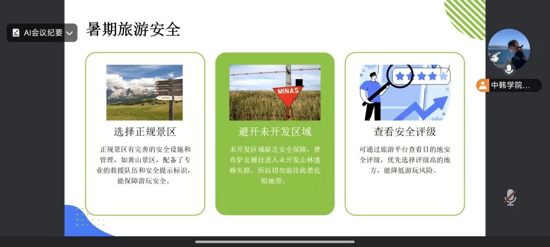 班会重点梳理了学生假期可能面临的各类安全隐患,形成覆盖"出行-游玩-居家-兼职-网络"的全场景防护方案。在出行安全板块,王老师详细讲解了公共交通"三查三看"原则(查车票信息、查携带物品、查紧急出口;看标识指引、看座位状态、看周边环境),针对自驾与骑行安全,她强调"三不原则":不无证驾驶、不疲劳驾驶、不违规载人,骑行时必须佩戴安全头盔并遵守交通信号。外出游玩时,王老师建议学生优先选择正规景区,避免前往未开发的"野景点"。团队出行需提前明确分工,指定应急联系人,随身携带急救包和通讯设备。