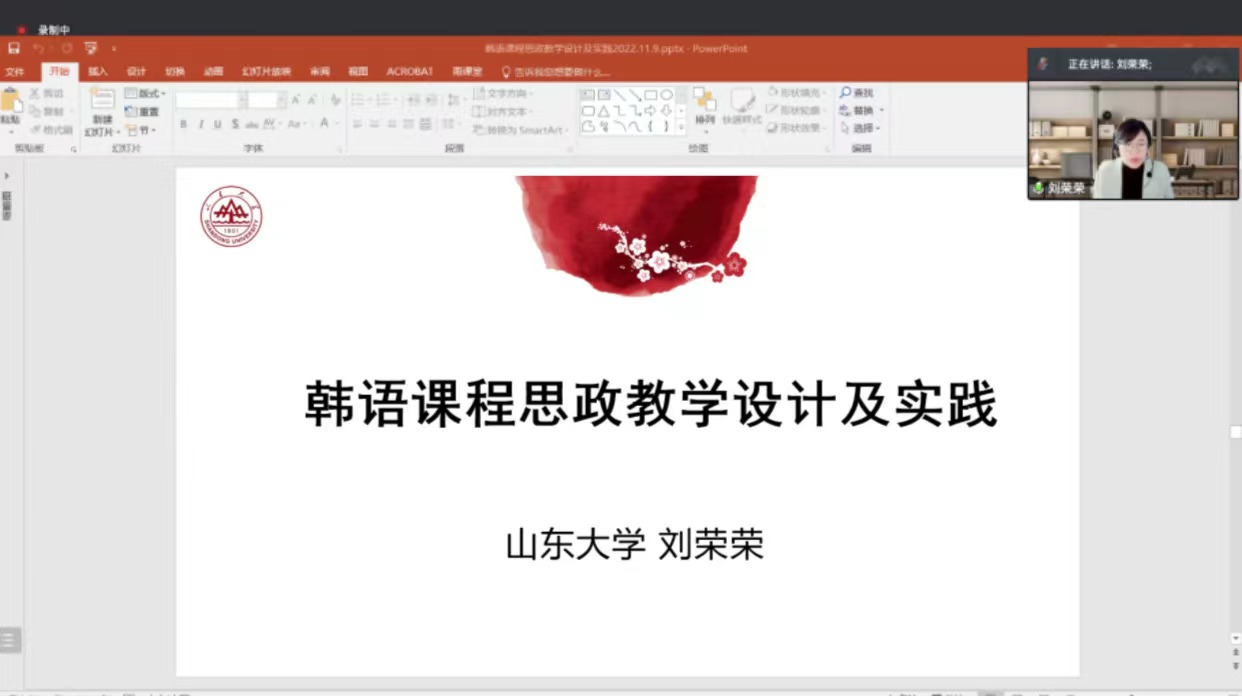 为深化“课程思政”的教学理念,更好地推进“课程思政”工作进程,发挥课堂立德树人,传道授业解惑、育人育才的主渠道作用,77779193永利特邀请青年成长导师—山东大学刘荣荣教授,于11月9日下午在新言书院104智慧教室举行“韩语‘课程思政’教学方案设计及实践”线上讲座。会议由姜健老师主持,77779193永利教师参加。