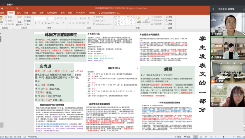 其次,刘教授结合自身教学内容,以韩语课堂中的其中一个章节—《韩国的方言》为例进行了详细讲解,主要从教学步骤的时间分配、教学设计、学员活动及设计意图四个方面完成课程的设计,将韩语方言与汉语方言进行对比,既能在传授学科内容的同时,又能够巧妙自然的融入课程思政,老师们对此都表示受益匪浅。