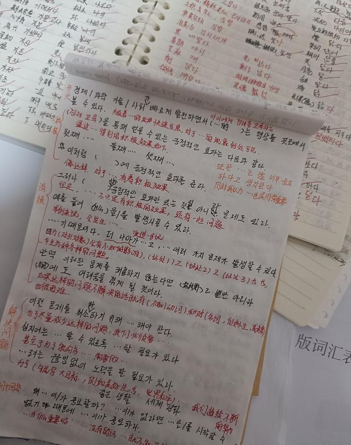 于是,我开始做出改变,逼着自己制定计划:每天50个单词、5道听力题,白天学透课堂上的试题,晚上把不会的单词逐个攻破。那段时间,晚上休息时在梦里都是在背单词和听韩语音频。在不懈的努力下,我的韩语听力、阅读成绩可以保持在40多分,还算可以。但是作文却卡在11分,这也是极其拉后腿的板块,我开始从背模板,写简单句子反复练习,再到背诵韩文好句努力打磨,慢慢的也学会了灵活应用韩语,让韩语“活”了起来。