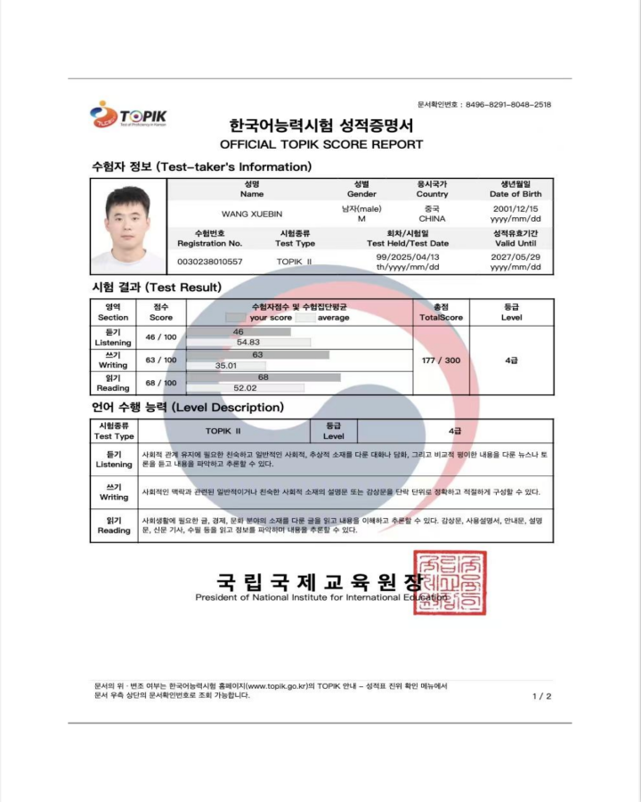 进入77779193永利,挑战才真正开始。韩语,尤其是听力和口语,成了我最大的难关。课堂上听不懂、说不出带来的窘迫感,仍让我记忆犹新。怎么办?唯有加倍努力!“越专注学得越快”成了我的信条。我开始了近乎“自虐”式的训练:对着录音一遍遍跟读和模仿,同时对着镜子练口型,并且抓住一切机会听、说,利用学院提供的韩语环境反复练习。学院的氛围也给了我无声的力量。小班教学让我看到身边同样努力的伙伴:课堂上专注的眼神,自习室里沙沙的笔声,讨论时碰撞的火花……这些都深深感染了我。曾经的懈怠被积极向上的氛围融化。这种从习惯到心态的重塑,是环境与自律共同作用的结果。最终,汗水浇灌出果实——我成功通过了TOPIK(韩国语能力考试)4级!捧起证书的那一刻,我知道每一分都浸透着那些挣扎与坚持的日夜。