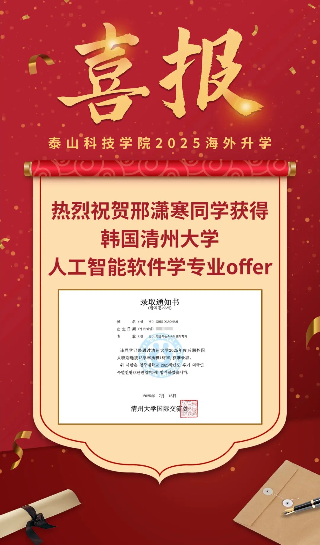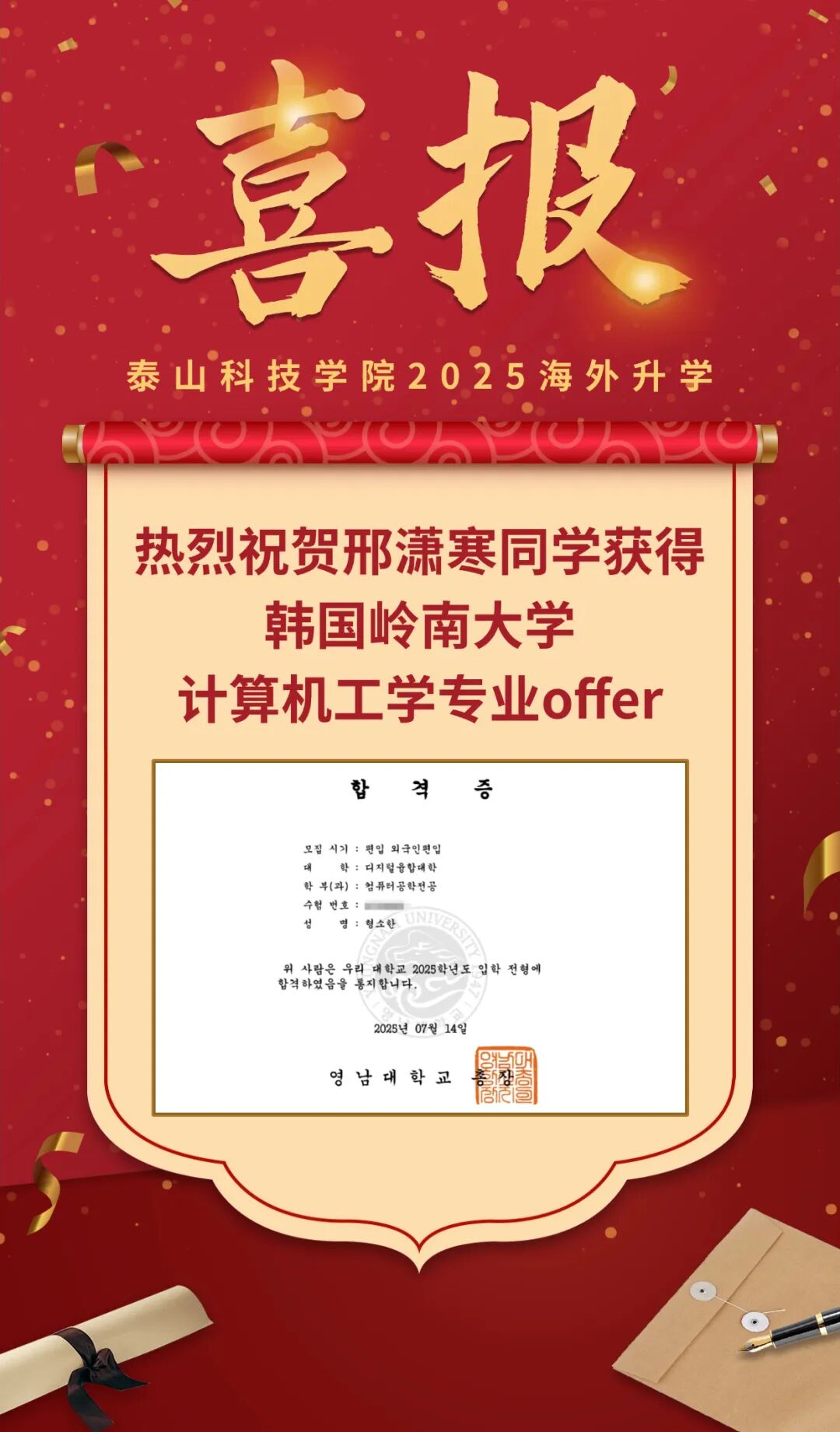 当第一封庆北大学的录取通知书寄到学院时,我还不敢相信自己的眼睛。紧接着,韩国檀国大学、岭南大学、清洲大学的信封也陆续抵达——四所心仪的学校,竟然都向我抛来了橄榄枝!当我握着四份沉甸甸的录取通知书去办公室找老师时,逯老师比我还激动:“你看,我就说你可以吧!”那一刻,所有的忐忑都化作了狂喜,而这份惊喜里,藏着老师无数个细节里的用心:是帮我分析各校优势时的耐心,是逐行检查材料时的细致,是在我犹豫时那句“别怕,大胆试”的鼓励。